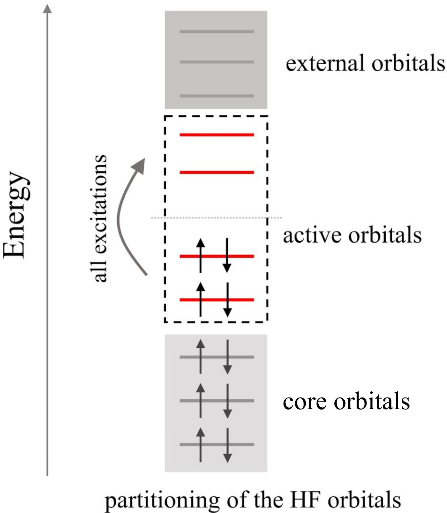 Post-Hartree-Fock (HF) electron correlation methods expand the many-body wave function as a linear combination of Slater determinants, commonly referred to as configurations. This configurations are generated by exciting electrons from the occupied to the unoccupied HF orbitals as sketched in the figure below. Since the number of configurations increases combinatorially with the number of electrons and orbitals this expansion can be truncated by defining an active space.